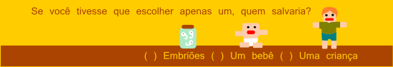Uma manhã ensolarada de domingo. Nenhuma dúvida paira no céu. Um dia perfeito para encontrar amigos e celebrar a vida. É exatamente isto que você vai fazer, à sua maneira, num protesto contra o aborto. Você encontra com o seu grupo em frente a uma clínica médica. Cada cliente ou empregado que passa pela porta faz vocês gritarem seus slogans mais alto. Eles não parecem se incomodar muito. De repente um amontoado de pessoas começa a sair correndo do prédio. Eles gritam. Após um momento de medo você entende a situação. Nas suas caras não há raiva, apenas medo. A clínica está pegando fogo! Uma mulher vem em sua direção gritando que o seu bebê ficou lá dentro. Você corre para a clínica enquanto o fogo se espalha. Um grito contínuo vem de um quarto. Um chute para abrir a porta e você vê, de um lado, um bebê chorando, de outro alguns tubos cuja etiqueta indica se tratarem de embriões. Sem hesitar você pega a criança e deixa os embriões. Quando você sai do prédio em chamas a mãe do bebê se aproxima numa atitude subserviente de gratidão. Você não consegue evitar o clichê para mitigar o desconforto de ser tratado como um herói. Eu só fiz o que qualquer um faria.