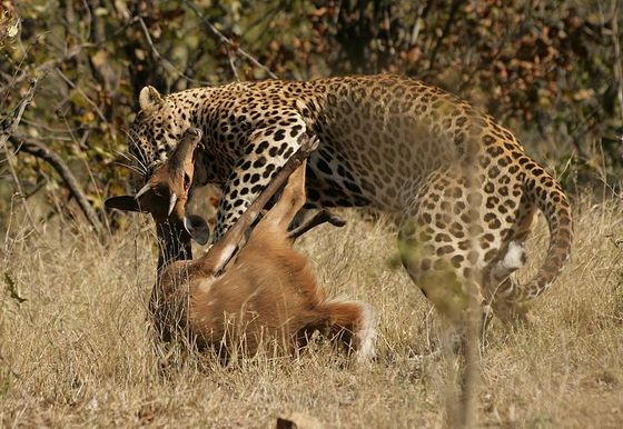 “A leoa enterra as suas garras afiadas na alcatra da zebra. Elas rasgam através da pele grossa e ancoram-se profundamente até ao músculo. O animal assustado solta um alto berro enquanto o seu corpo cai no chão. Um momento depois, a leoa retira as suas garras da traseira da zebra e afunda os seus dentes na garganta, asfixiando o som de terror. Os seus caninos são longos e afiados, mas um animal tão grande como a zebra têm um pescoço maciço, com uma espessa camada de músculo debaixo da pele, pelo que, apesar de os dentes furarem a pele, são demasiados pequenos para atingir qualquer dos principais vasos sanguíneos. A leoa tem assim de matar a zebra por asfixia, apertando as suas poderosas mandíbulas à volta da traqueia da vítima, cortando o acesso de ar aos pulmões. É uma morte lenta. Se tivesse sido um animal pequeno, como uma gazela de Thomson (Gazella thomsoni) do tamanho de um grande cão, a leoa teria mordido a nuca da presa; os seus caninos teriam então provavelmente esmagado as vértebras ou a base do crânio, causando morte instantânea. Sendo como é, os estertores da zebra vão demorar cinco ou seis minutos”[McGowan, pp. 12-13]