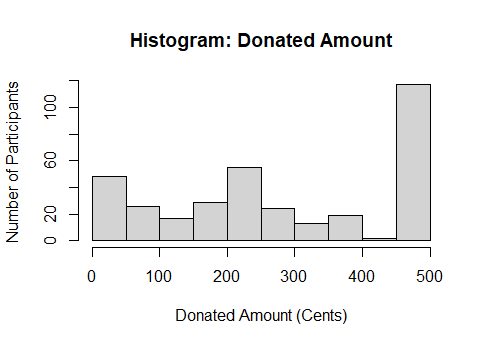 O total das doações acabou distribuído em três picos, nada, meio e tudo. A doação total (5 dólares) foi a que mais ocorreu. Certamente, nesse caso, temos que descontar o fato de que a quantia de dinheiro oferecida não era muito grande. Quando separamos as duas condições, o cenário da Narrativa é um pouco mais extremo, mas eu não incluo os gráficos dessa separação.