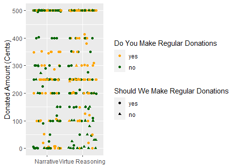 Além disso, no estudo citado acima de Lindauer et al., que identifica uma melhor performance do argumento ao levar a doações, podemos ver que as maiores doações são altamente correlacionadas com o fato de o participante ser alguém que já faz doações. Assim, ainda que tenha havido uma mudança em grau (quantidade da doação), não houve mudança clara no comportamento. Em vista disso, separamos quatro elementos sobre os quais gostaríamos de obter mais informações.