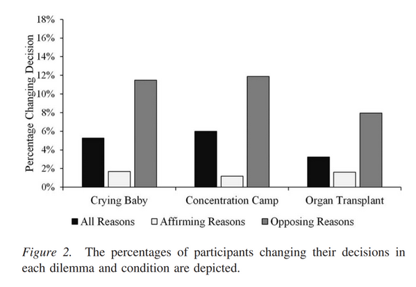 Em alguns contextos muito comuns, foi identificado que argumentos não obtêm o sucesso esperado ao mudar as crenças e opiniões dos participantes. Por exemplo, Stanley et al. (2018) apresentaram dilemas morais aos participantes e bons argumentos que sustentam um julgamento de tais cenários que vai contra o senso comum. Como podemos ver, mesmo nas condições que tiveram mais sucesso, a porcentagem de mudança de opinião é baixa.