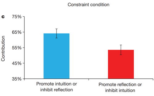 Rand, Greene & Novak (2012) testaram várias condições que impelem as pessoas a adotarem uma postura mais reflexiva.2 Depois disso, eles participaram de jogos de cooperação. Como podemos ver, há uma redução de cooperação nos participantes que foram incentivados a refletir mais. A intuição parece ser mais cooperativa.3
