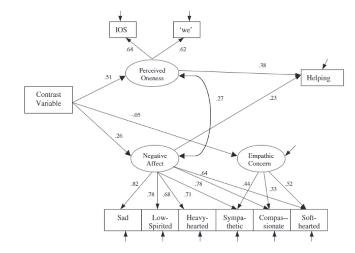 Nota: o gráfico é muito complexo, mas o que interessa mais é o aumento na ‘perceived oneness’ (perceber unidade com que se toma a perspectiva) e o aumento no ‘a ajuda‘ (helping).
