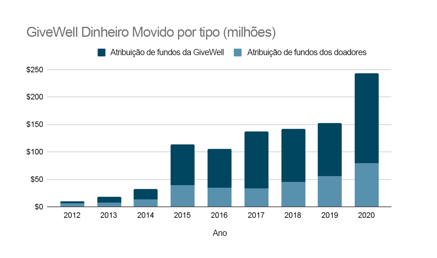 [1] Isto inclui dinheiro que concedemos do nosso Fundo de Máximo Impacto, bem como financiamento que recomendamos à Open Philanthropy. As quantias em dólares e as estimativas de impacto citadas neste post são extraídas em grande parte de dados internos não publicados. Para mais informações sobre o dinheiro que atribuímos em 2020, veja o nosso relatório de métricas de 2020.