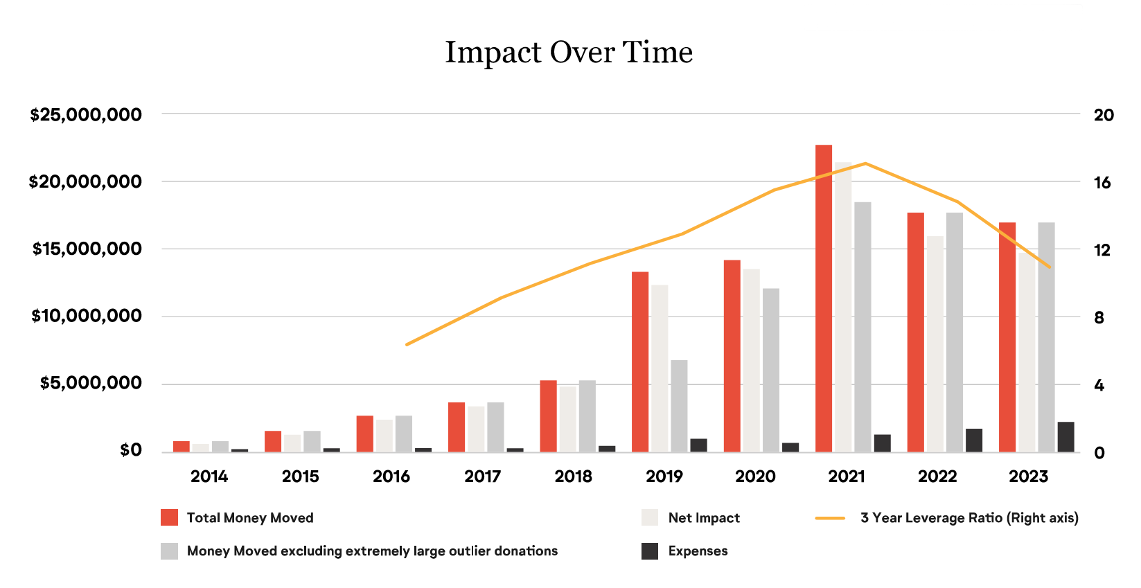 Impacto líquido: Medimos o nosso impacto líquido subtraindo as nossas despesas anuais totais do total de dinheiro movimentado para as nossas organizações sem fins lucrativos recomendadas. Em 2023, o nosso impacto líquido foi de cerca de 14,4 milhões de dólares, pois gastamos cerca de 2,2 milhões nas nossas operações globalmente e angariámos cerca de 16,6 milhões para as nossas organizações sem fins lucrativos recomendadas.